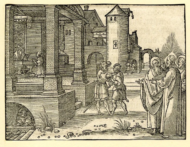 Verses 23 thru 35 are cited in a footnote to The Small Catechism, The Lord's Prayer, The Fifth Petition (SC 3.15, n. 71) noting that these verses are the basis for the woodcut that goes with the petition.